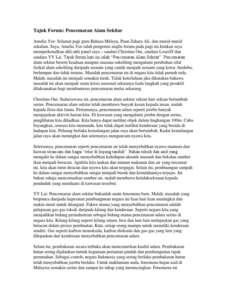 Teks Forum Pencemaran Alam Sekitar Docx Teks Forum Pencemaran Alam Sekitar Pengerusi Faris Irfan Bin Shamsul Aznan Ahli Panel Pertama Norizman Bin Course Hero from www.coursehero.com Pelbagai kesan akan dirasai oleh penduduk yang berhampiran dengan kawasan ternakan. Pencemaran alam sekitar kini berleluasa di bumi kita ini dan mendatangkan pelbagai masalah kepada manusia, haiwan dan tumbuhan. Penggunaan bahan api fosil yang tidak terkawal. Selain individu, organisasi seperti pemilik kilang juga turut menjadi agen penyumbang kepada masalah pencemaran alam sekitar. Buktinya, para pengkaji menjumpai kesan terbakar di dinding gua tempat manusia tinggal pada zaman dahulu. Jumlah itu menggambarkan mentaliti masyarakat yang tidak begitu prihatin terhadap penjagaan alam sekitar dengan membuang sampah sesuka hati tanpa mengambil kira kesan kepada alam serta kehidupan manusia. Pencemaran alam sekitar bererti keadaan ataupun suasana sekeliling mengalami perubahan sifat fizikal alam sekeliling daripada sesuatu yang cantik menjadi sesuatu yang kotor, berdebu, berlumpur dan tidak terurus. Environmental policies & media reporting in malaysia.