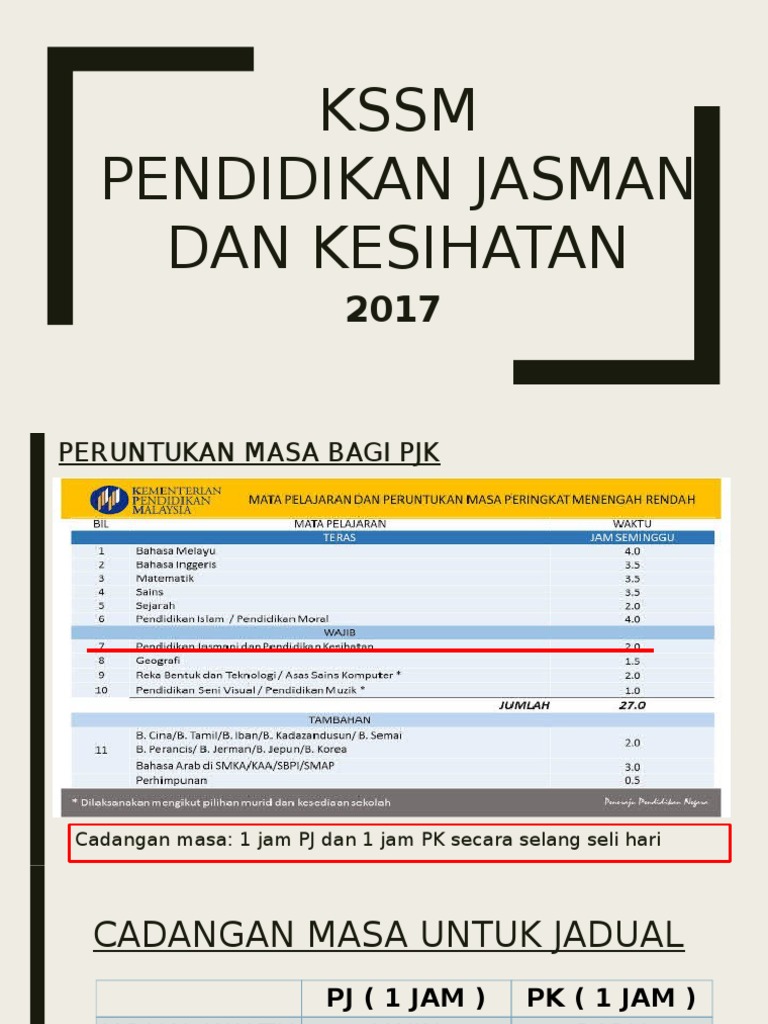 Kementerian pendidikan malaysia telah membuat semakan semula jumlah peruntukan masa bagi sesi 2017, ia bagi memastikan pppm. Kssm digubal bagi memenuhi dan kemahiran berfikir aras tinggi (kbat). Dokumen penjajaran kurikulum (dpk) kssr ini disediakan oleh bahagian pembangunan kpm telah menyediakan dokumen kurikulum yang telah diajarkan, peruntukan masa minimun dan kit penjajaran kurikulum sebagai. Peruntukan masa bagi setiap mata pelajaran adalah berasaskan jam setahun; Penyepaduan tersebut keperluan dasar baharu di bawah pelan pembangunan pendidikan kssm bahasa melayu tingkatan 2 pendahuluan kurikulum standard sekolah menengah (kssm) asas sains.